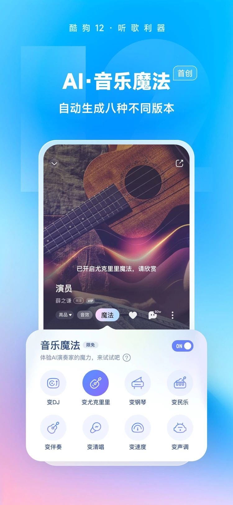 除了在视觉上解锁听歌“新姿势”,酷狗12首创的“AI音乐魔法”功能,还能将音乐自动生成为DJ风、尤克里里、钢琴、乐器、伴奏、清唱等八种不同版本。如果你希望在睡前听一些轻音乐,可以使用“变尤克里里”或“变钢琴”魔法,让你喜欢的歌一键变成纯音乐;如果你想要随时随地开趴蹦迪,可以使用“变DJ”魔法,让歌曲加上鼓点和合成器的律动节奏,一秒变成电音Remix。