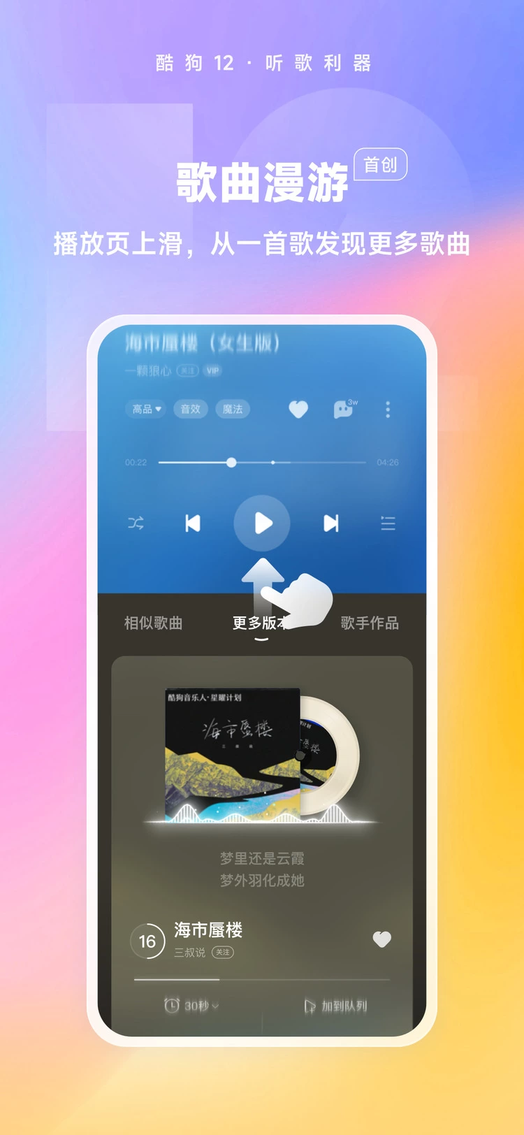 据了解,这次酷狗音乐升级,不仅带来了更丝滑的操作体验,更有趣的创新功能和更极致的音质听感,全新“歌曲漫游”功能,也让发现好音乐变得更简单、高效。用户仅需在歌曲播放页轻轻上滑,就能开启“歌曲漫游”,聆听歌曲的“更多版本”、“相似歌曲”,亦或是解锁更多“歌手作品”,让喜欢的歌一直出现。