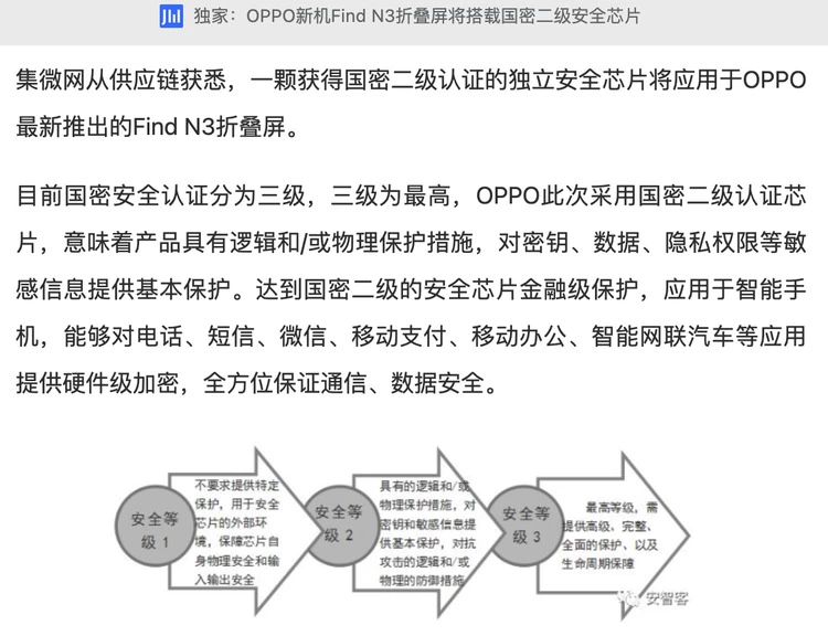单纯的影像升级还不够,OPPO Find N3在安全性能方面也有提升。有报道称,OPPO Find N3将搭载拥有国密二级认证的独立安全芯片,这是目前手机市场的商用最高安全等级,同时加入代号为"孤岛"的自研安全技术,部署了相关的自研专利,旨在从底层解决手机的隐私安全问题,确保用户的通讯以及数据安全。基于此也能看出,OPPO Find N3将会调整为超高端定位,为高端商务人士提供着高等级隐私保护、高效交互、沉浸大屏等体验。