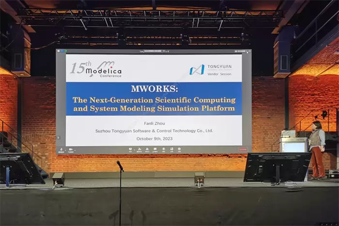 2023年10月9日-11日,第15届国际Modelica会议在德国亚琛顺利召开。作为国际领先、亚洲唯一的Modelica编译求解内核引擎供应商,苏州同元软控信息技术有限公司(简称“同元软控”)携新一代科学计算与系统建模仿真平台MWORKS参加此次会议。会议期间,同元软控宣读了4篇研究文章,并做供应商报告,这是亚洲团队首次在国际Modelica会议上作供应商报告。