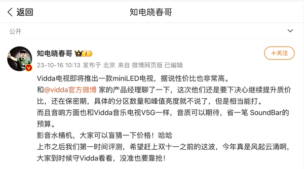 科技博主曝光Vidda将推miniled高端电视 性能配置极具竞争力