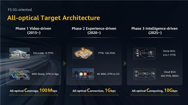 高清视频驱动了百兆建网、体验升级正在驱动千兆建网,智能应用将驱动万兆建网,运营商在不同业务发展阶段应该建设最合适的全光目标网方案,从而实现业务体验最佳,获得商业成功。在F5.5G时代,三个阶段的全光目标网络将平行持续发展,共同推动产业迈向全光新纪元。