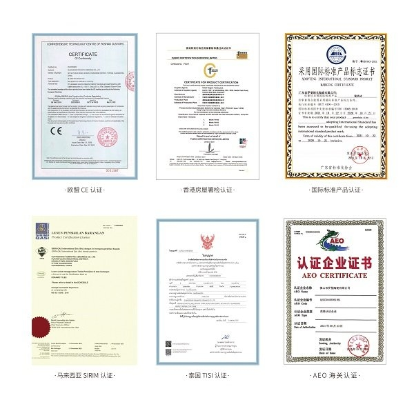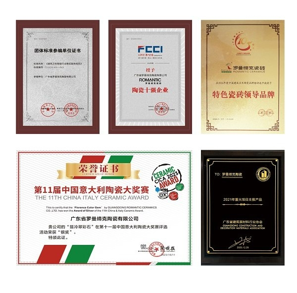 截止到目前,已取得了外观设计专利60多项,并先后获得了“陶瓷十强企业”,“设计师首选推荐品牌”,“中国绿色产品认证证书”,“能源管理体系认证证书”等国内荣誉。及获得了欧盟CE、香港房屋核检、马来西亚产品质量、海关AEO、ISO9001、ISO14001等一系列国际质量证书,让罗曼品质做到全球统一标准。