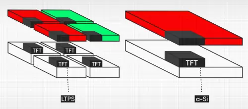 为了解决 a-Si 的问题,有厂商研发出了 LTPS 低温多晶硅技术,LTPS 对比 a-Si有着质的提升,它拥有轻、薄、低能耗等优点,可以实100cm²/v·s的电子迁移率,相比较a-Si 的电子迁移率只有 0.5-1cm²/v·s,所以 LTPS 的电子移动速度要比 a-Si 快 100倍,所以整个 TFT 的外观尺寸会比 a-Si 小很多,在同尺寸下能安排下更多的像素点。因此,LTPS的像素密度可以做到比 a-Si 更高,提供更高的分辨率以及更艳丽的色彩。