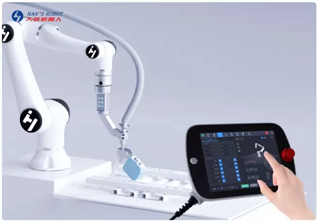 更适合焊接的机械臂结构:相对于传统协作机器人,大族机器人采用独特的双关节模组设计,一个运动模组包含两个关节,构成独特的运动学结构,焊接作业时能够获得更高灵活度;机械臂末端设计更简单、实用,通过按键操作即可快速建立焊接任务;焊接配置所需的线缆均通过内走线的方式布局,“藏”于机械臂内部,可以有效避免因外部线束干扰而产生机械臂运动范围受限、通讯信号被干扰等问题。