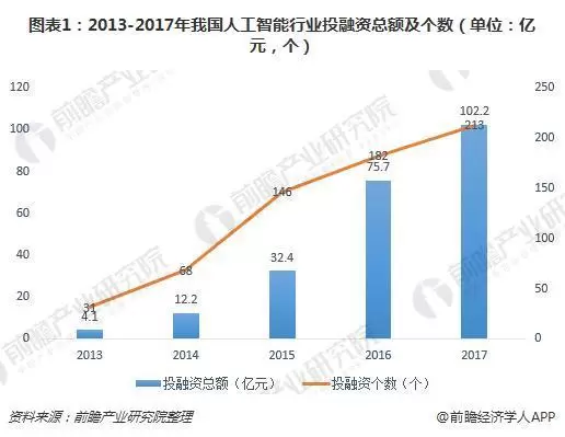 2015年是人工智能领域爆发式增长的关键一年,投资案例从2014年的68起激增到2015年146起,同比增长114.7%;投资总额从2014年的12.2亿上升至2015年的32.4亿元人民币,同比增长165.6%;2016年,人工智能领域延续了上一年较高的投资热度,2017年的投资额就超过100亿元人民币,红杉、IDG、达晨、经纬、真格基金、创新工场等创投机构成为助推。