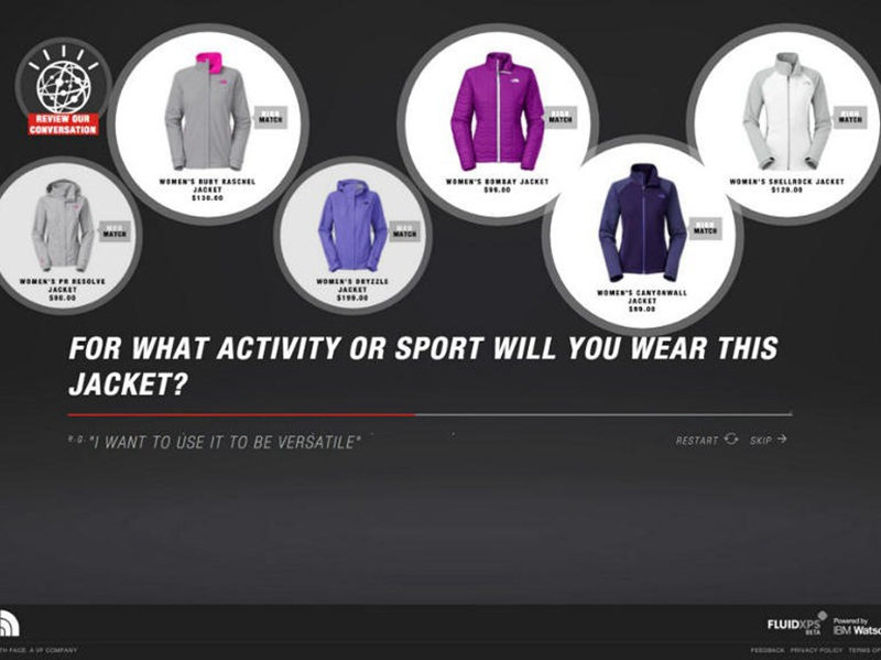 全球知名户外品牌The North Face与IBM合作,推出基于Watson的Expert Personal Shopper应用程序,为每位客户提供个性化的产品建议。该APP先分析用户的需求,然后分析大量的产品数据、旅游攻略、博客文章等,根据实际用途和气候特征,筛选并为用户推荐最合适的出行产品和装备。