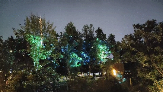 光峰科技团队以树木投影为主、辅以公园步道沿线的异面建筑投影,通过12台光峰工程S系列激光投影机,让夜晚的公园成为森林奇幻空间。同时搭配精心设置的沉浸式观赏路线,将夜游画面从头到尾串连在一起,将故事娓娓道来,让各国运动员、市民及游客朋友沉浸其中。