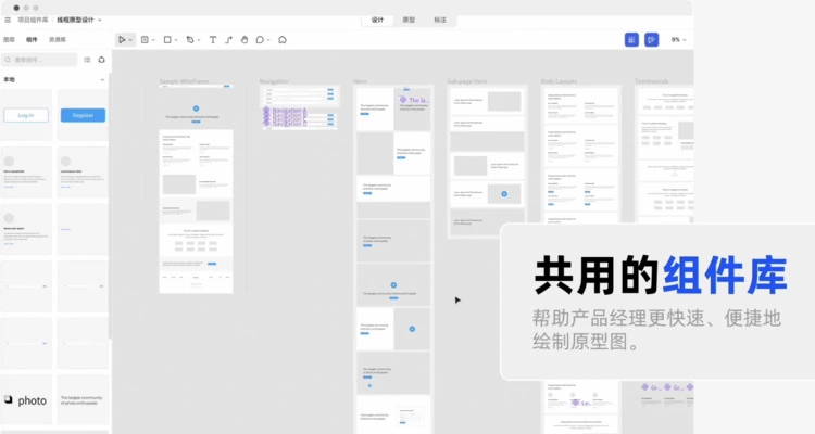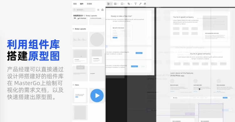 第一,通过MasterGo提高生产效率,可视化表达产品需求,产品经理可以直接通过设计师搭建好的组件库,在MasterGo上绘制可视化的需求文档,以及快速搭建出原型图。