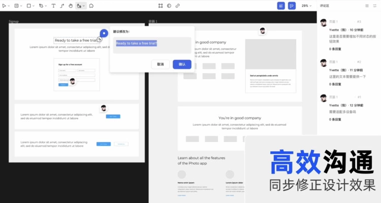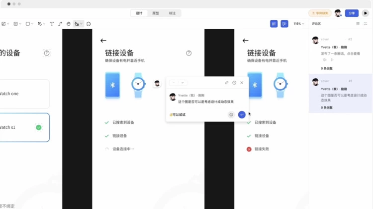 当产品经理对设计中的某些细节有疑问时,可以在文件中使用评论功能,在有问题的地方设置标记,并输入文字评论,来实时反馈意见。或者使用圈话功能,通过语音+录频的形式,在画布中圈出有问题的地方,然后把我们想说的话录下来。基于产品经理的反馈,设计师可以直接在产品经理的评论下进行解释说明,这种沟通交流的方式会更加直观、高效。并且以上这些修改建议都会留存在设计文件内,以便后续溯源。