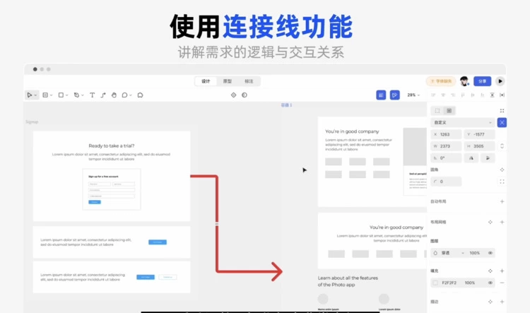 除了添加批注,产品原型图中还需要讲解这个需求的逻辑关系或者页面的交互关系,这时可以使用MasterGo的连接线功能:点击形状工具栏下拉框中的连接线工具或者使用快捷键X,就可以在画布中为这些图进行连线,添加文字批注,调整连线的颜色、粗细,修改连线的路径,并且在画布中挪动图层,连接线也会跟着一起移动,无需手动调整,操作起来非常方便!