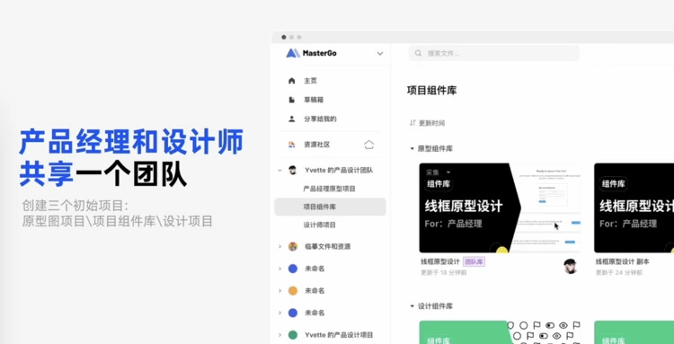 首先,在MasterGo上,产品经理和设计师需要有团队共享空间。这里可以存放原型图、以及设计图,方便大家了解项目进度;其次,设计团队需要用MasterGo搭建一套产品团队和设计团队共用的组件库,帮助产品经理更快速、便捷地绘制原型图。