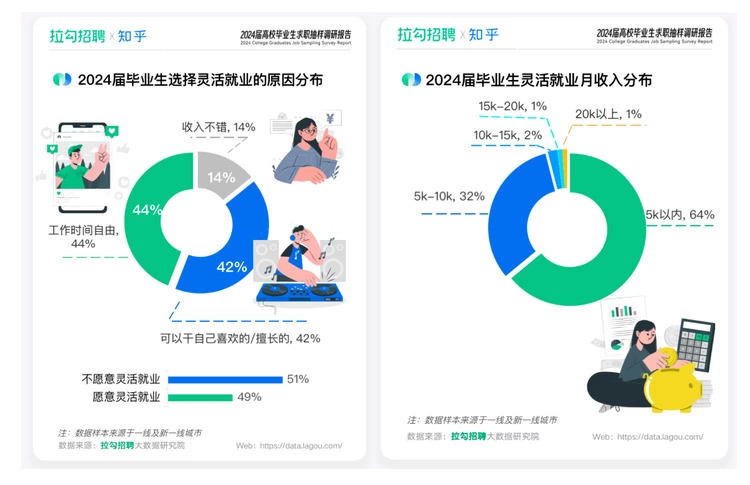 《报告》显示,对于2024届毕业生在毕业之后的就业意愿中,有近一半的受访对象愿意选择灵活就业,“爱自由、重爱好”,成为2024届毕业生选择灵活就业主基调。