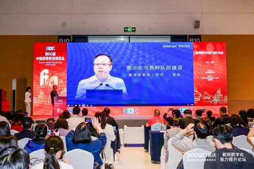 12日下午,希沃还在展会现场举行了教师数字化能力提升论坛。邀请了教育部教师工作司副司长翁波、北京师范大学教授李玉顺、华中师范大学教授陈敏、华南师范大学教授王红、山东师范大学教授赵曰峰以及广州视睿电子科技有限公司(希沃)副总裁魏振水出席论坛,在分享相关案例的同时,共同探讨教师教育体系高质量发展的新路径。