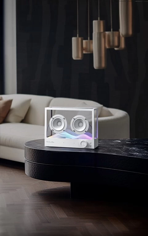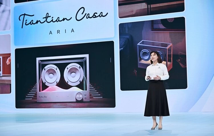 Tiantian Casa PENINSULA采用皮革+金属材质碰撞的轻奢复古设计,白色荔枝纹皮革质感柔滑细腻,几何形金属网面简洁利落,创新艺术底座不仅纹理细密有光泽,还具有高级悬浮视觉感,整体造型简约大气,拥有磐石一般的温润丰厚质感。Tiantian Casa ARIA则采用的是富有艺术感的纯净透明机身设计,线条简明爽利,剥离一切外在繁琐装饰,科幻感、未来感十足,直观呈现通透的声音之美。两款差异化颜值风格的新品可适配用户不同的质感家居搭配选择。