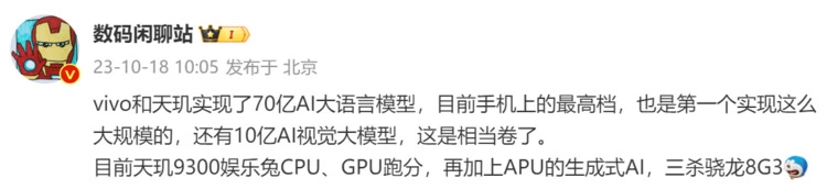 数码闲聊站爆料称:“vivo和天玑实现了70亿AI大语言模型,目前手机上的最高档,也是第一个实现这么大规模的,还有10亿AI视觉大模型,这是相当卷了。目前天玑9300娱乐兔CPU、GPU跑分,再加上APU的生成式AI,三杀骁龙8G3。”