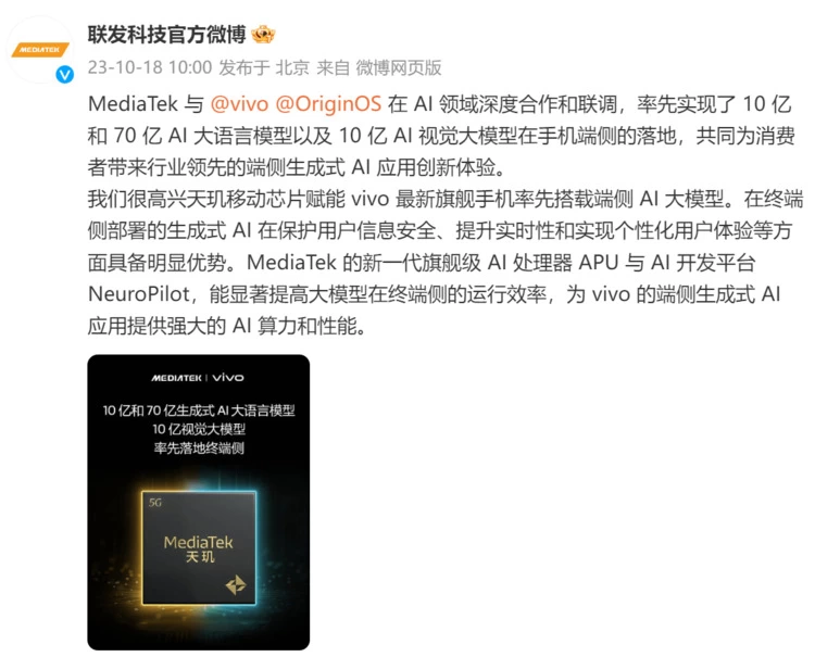 行业第一!70亿AI大模型首次落地手机,联发科vivo在端侧生成式AI技术上遥遥领先