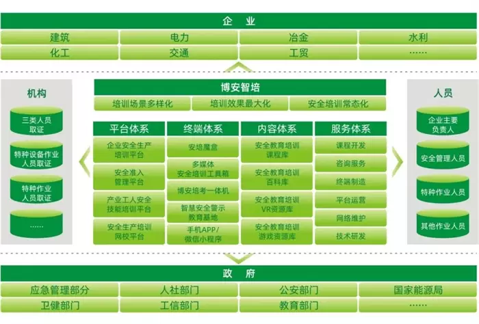 云平台通过与多媒体安全培训工具箱、安全培训智慧终端、安培魔盒、博安掌中宝、智慧安全警示教育室(中心、基地)等多种安全培训学习智能化终端工具的匹配互联,向安全教育培训“云+端”全谱系应用场景不断延伸,从而实现可覆盖全行业、多领域、各层级、全岗位人员,可满足多元使用场景需求的“一站式”安全培训产品服务应用生态,打造国内第一的智慧安全培训综合服务平台。