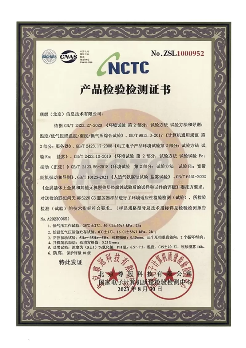 联想问天 WR5220 G3服务器防腐、盐雾、振动、低气压检验检测证书
