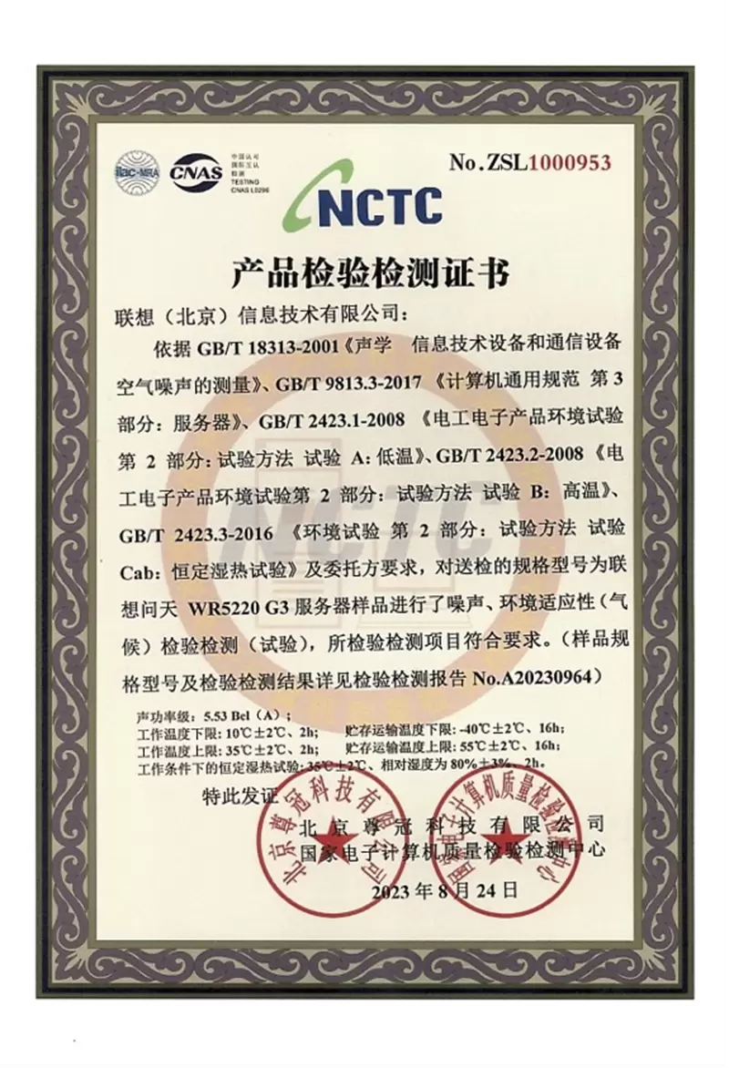 联想问天 WR5220 G3服务器噪声、环境温度检验检测证书