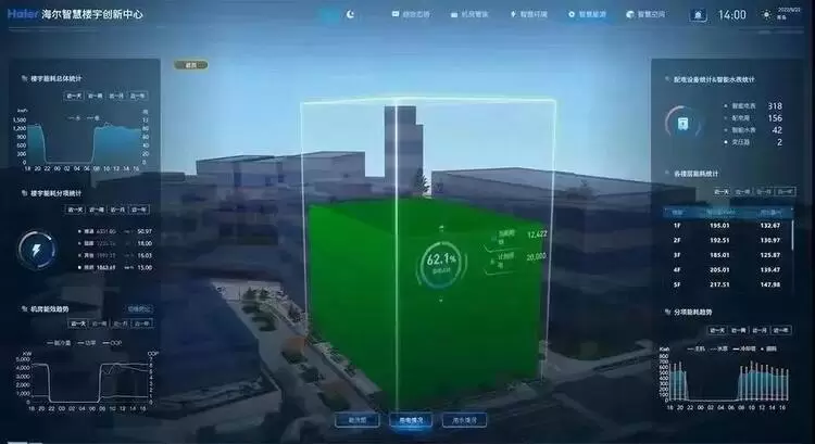 在海尔智慧楼宇事业部的办公大楼里,记者看到,一间十多平米的机房就可以支撑整栋大楼的运转,并且区别于传统大厦机房的闷热,这里的温度始终清新舒适;通过楼宇大脑,可以实时观测每层楼的用电情况;也可以通过诸多高效储能的设计,实现电力储存。