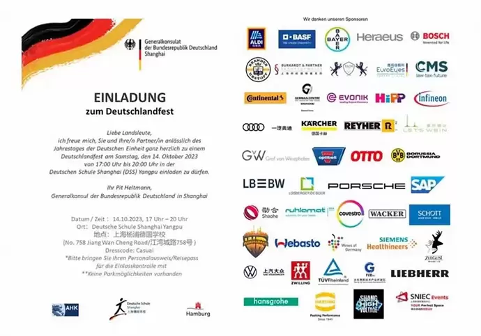本次Deutschlandfest庆祝活动由德国驻上海总领馆主办,BASF巴斯夫、Audi奥迪、Bayer拜耳、Bosch博世在内的汽车、医疗、化工、教育行业几十家知名德国企业合力支持。