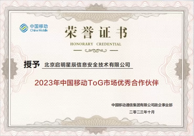 大会上,启明星辰获得了中国移动颁发的“2023年中国移动TOG市场优秀合作伙伴”荣誉。自达成战略合作以来,启明星辰积极融入中国移动发展大局,对内战略协同,对外市场突破,实现了协同业务的创新性增长。在数字经济发展的关键时期,启明星辰将与中国移动深化合作,通过生态协同探索技术创新、场景应用延伸,将强大的产品、技术、服务势能转化为发展动能,打造多方位、深层次的合作及标杆项目,为各级政务构建更强大更全面的网络安全防护能力,加速推动数字政企高质量发展迈入新阶段。