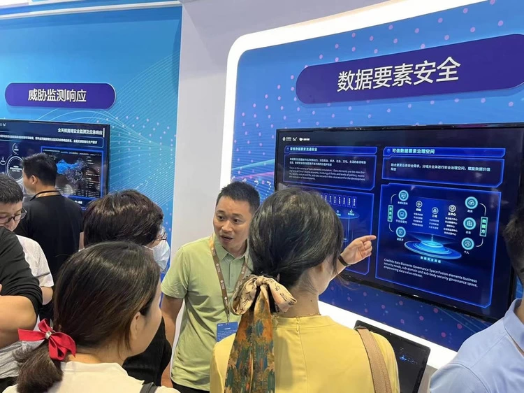 在中国移动展台“数据+安全”版块,启明星辰与中国移动聚焦“数据要素流通安全”,重点展示了融合创新成果——基于安全一体化+算力网络的数据安全流通底座。该方案提供完整的嵌入式安全可信环境,保障数据要素流通共享中的数据价值安全。方案践行“安全+业务”的协同框架,构建数据授权、防护、管控、监测及运营的安全五中心,解决数据从业务域到开放域过程中的复杂安全问题,为数据的跨域流动及跨域使用提供必要的安全、可信、合规环境,促进数据要素有序流转。