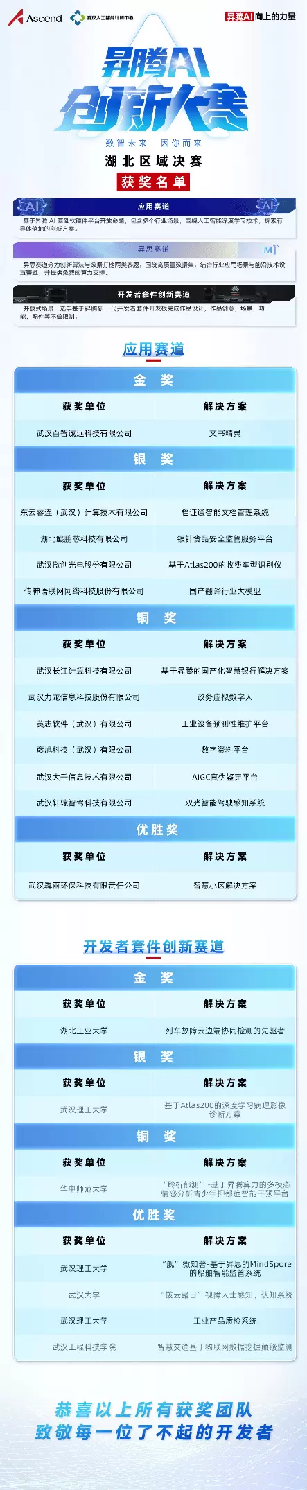 评审团由学术领域带头人、产业领袖及技术专家组成,从技术创新、商业价值以及用户体验等多维度进行评审,最终共评选出应用赛道金、银、铜和优胜奖共12名,开发者套件创新赛道金、银、铜奖和优胜奖共7名。其中,武汉百智诚远科技有限公司的文书精灵、湖北工业大学的基于Atlas 200I DK的云眼守望者入围全国总决赛,将代表湖北区域昇腾AI开发者征战全国。