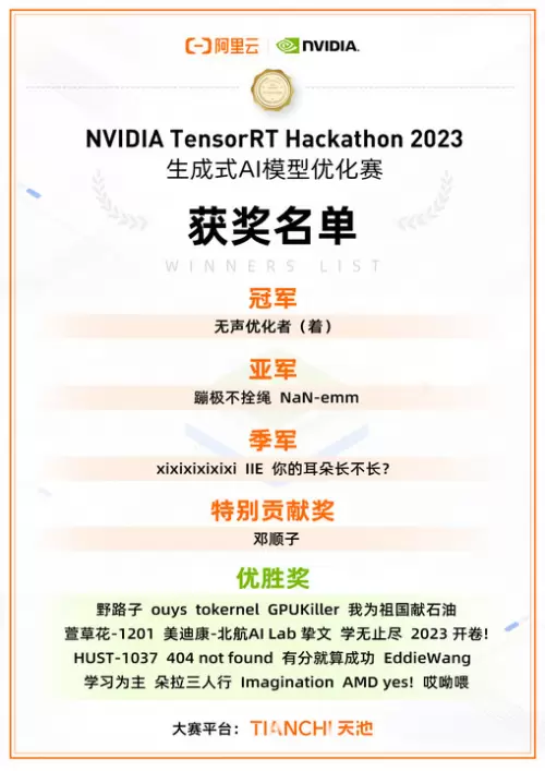 2023年9月 29日,由阿里云、NVIDIA联合主办,阿里云天池平台承办的“NVIDIATensorRTHackathon 2023生成式AI模型优化赛”圆满落幕。该赛事自2020年以来,已成功举办三届,本届赛事于今年 7月启动,吸引了来自全国729支开发者团队报名参赛,其中共有 40支团队晋级复赛,最终 26支团队于决赛中脱颖而出,分获冠军/亚军/季军及优胜奖,展现出了卓越的技术实力。