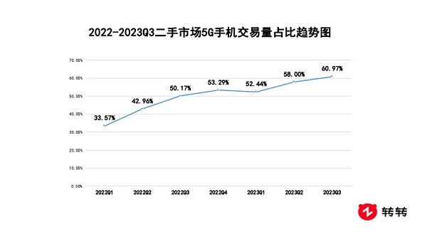 二手市场方面,受大量新机上市的助推,5G机型的交易可谓炙手可热。Q3转转集团手机行情显示,5G手机总交易量占比连续上扬,并成功超过六成,达到60.97%,同比增长10.8%,环比增长2.97%。至此,二手5G手机的交易量已连续5个季度占比过半。