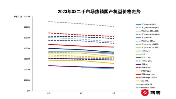 价格方面,Q3转转集团手机行情报告显示,国产主力机型均维持了降价的趋势,降幅多在100-300元。其中,华为Mate 40 Pro+降幅最高,9月平均价格相比7月下降了451.34元。其他品牌中,高端机型的价格降幅相对较大,如OPPO Find X6 Pro的价格下降幅度同样超过了400元。