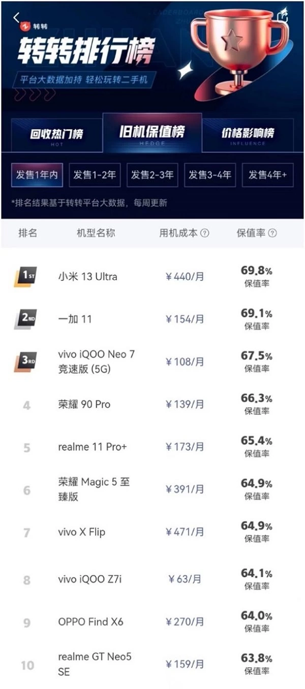 Q3转转集团手机行情显示,发售1年内的机型中,保值率前十机型均为国产品牌。小米13Ultra以69.8%的保值率排名第一,一加11以69.1%的保值率排在第二,vivo iQOO Neo7以67.5%的保值率排在第三。