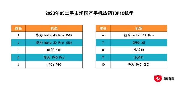 就热门机型来看,华为和小米势均力敌,华为共计上榜5款机型,小米共计上榜4款机型。其中,小米13取代华为Mate30成为Q3新晋上榜的机型,排名第八。华为P40 Pro名次上升3位,为第四名。而2018年上市的国产“神机”OPPO A5仍在榜单之内,位列第七。