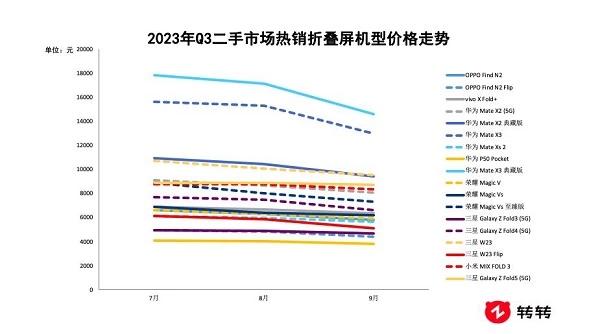 三季度,折叠屏更新迭代的速度加快,华为、荣耀、vivo、小米等主流厂商均有新品推出。不过,除了华为Mate X5、三星Galaxy Z Fold5之外,其他品牌产品起售价格都没有破万元。新机的大量上市,也使得旧机的价格普遍下滑。