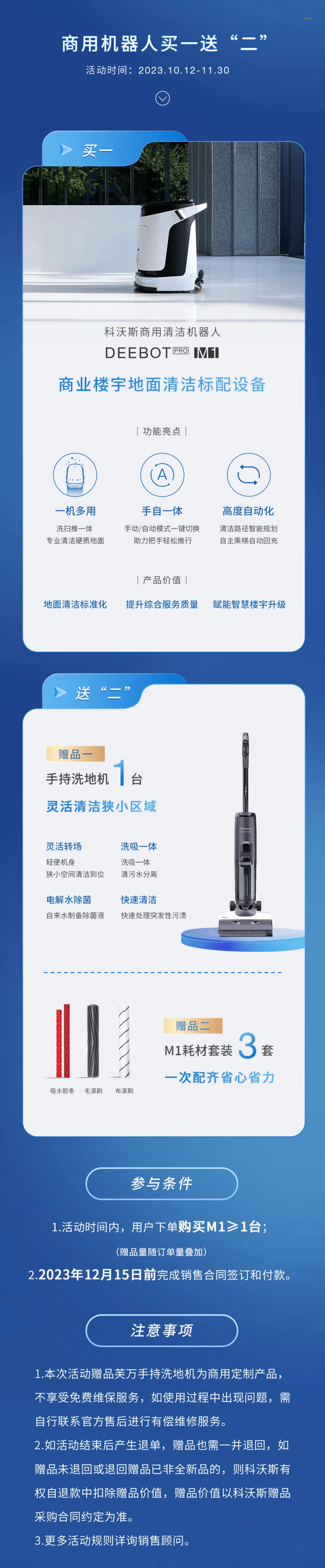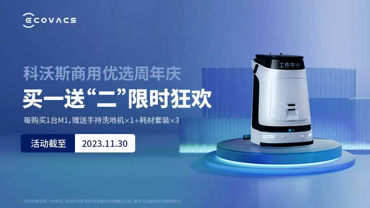 买一送“二”优惠活动截至2023年11月30日,活动期间,科沃斯商用优选平台注册用户购买M1,每购买一台,赠送一台手持洗地机和三套耗材,立即参与活动锁定优惠(详细规则请至科沃斯商用优选平台了解)
