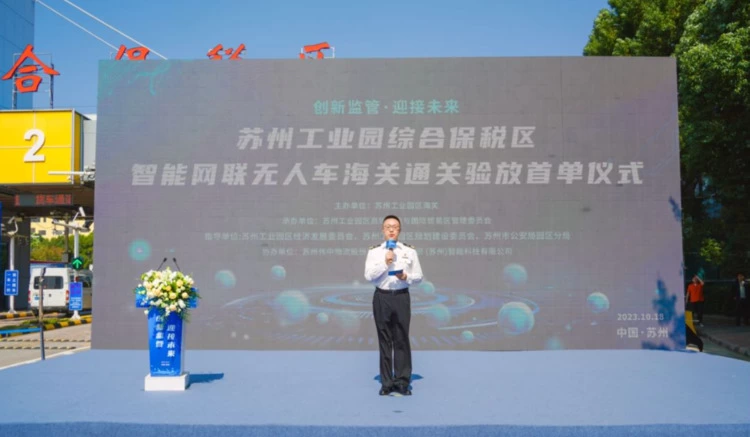 2023年10月18日,中国江苏 – 今日,全国首个智能网联无人车在综合保税区通关验放全场景下应用项目——苏州工业园综合保税区智能网联无人车通关验放项目正式启动,并在苏州工业园综合保税区海关主卡口外举行“2023 苏州工业园综保区智能无人车首单仪式”。