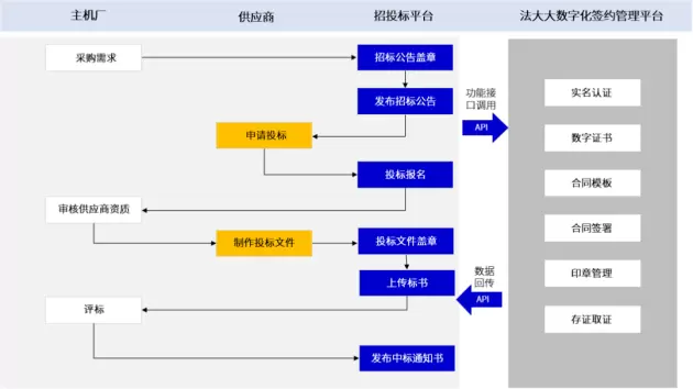 通过法大大开放平台实现与招投标系统的快速对接;可实现主机厂发布采购需求后,在招投标平台对招标公告盖章后发布,供应商在招投标系统申请投标,并完成企业实名认证,主机厂审核供应商资质后,供应商制作标书,并加盖公章后上传至招投标平台。主机厂评标后,发布中标通知书。通过法大大新一代数智化签约管理平台,可实现主机厂及供应商招投标全线上完成,大幅降低招投标时间周期。