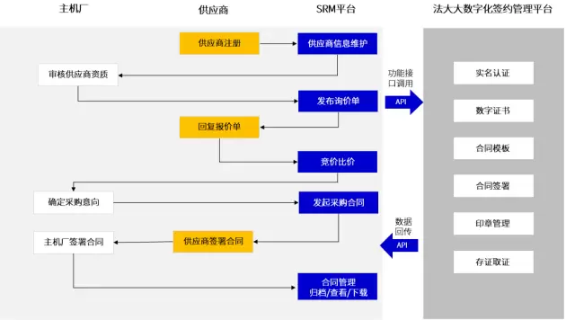 通过法大大开放平台实现与SRM系统的快速对接;可实现供应商在SRM系统完成实名认证后,完成供应商注册。主机厂完成供应商资质审核后,发布询价单,供应商在SRM系统上传报价,价格磋商后,主机厂确定采购意向,在SRM系统发起采购合同流程,供应商登录SRM系统查看合同并完成签署,主机厂完成合同签署,双方签署完成后合同进行归档,后续主机厂或供应商可登录SRM系统进行合同查看及下载。