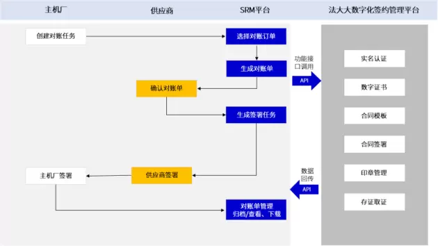 通过法大大开放平台实现与SRM系统的快速对接;可实现主机厂需要对账时,在SRM系统选择需要对账订单,调用电子签模板服务,自动生成对账单。供应商登录SRM系统,查看对账单无误后确认盖章,供应商完成盖章后,主机厂完成盖章,可选择批量盖章。双方盖章确认完成后,对账单归档在对应订单下,主机厂或供应商可随时查看、下载对账单。