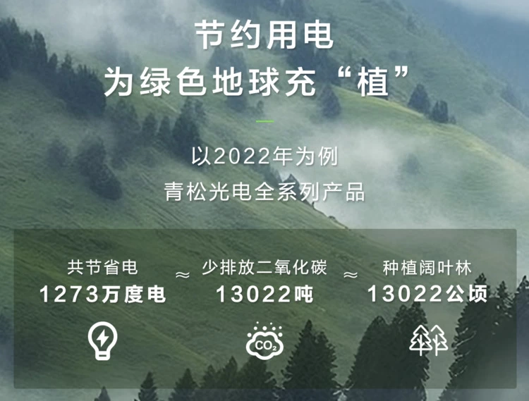 QSTECH青松光电是行业内率先研发节能技术与产品的企业之一,于2023年推出了LED“碳”索计划,建立碳足迹体系,持续深耕,推动开展技术研发、产品生产、场景应用等减碳工作,打造“绿色全链路”。全系列产品一年可为业主节电1273万度,相当于为地球种下13022公顷阔叶林*。