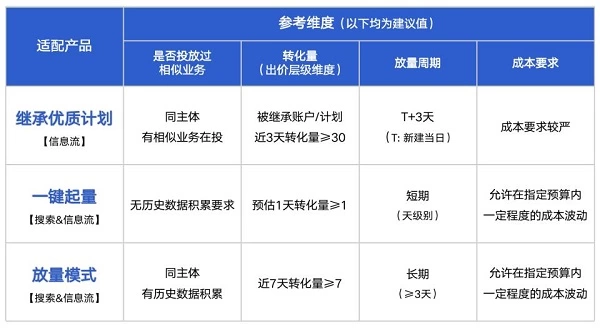 如果同一个主体下,存在相似业务的计划正在投放,并且这些被继承的账户和计划表现良好(近3天计划转化量≥30),那么「继承优质计划」功能应当被优先考虑选用。