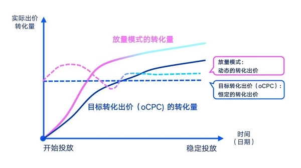 基于广告主设置的预算,结合AI智能系统对流量和竞争环境的实时分析,以动态调整广告出价。通过这种方式,放量模式能够确保广告在竞争中始终保持优势,从而为广告主在预算范围内争取到最大的转化量。其作为一种长期投放策略,尤其适合那些希望持续扩大市场份额和提升品牌影响力的广告主。