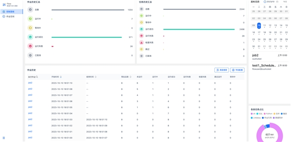 Flow 5.4进一步丰富了控制面板的功能,新增定时日历、任务占比、作业历史统计图等功能,帮助用户更方便地了解Flow的使用情况。此外还新增了作业的移动和复制、任务历史等功能。