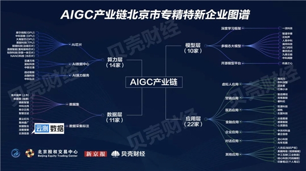 《图谱》显示,在AIGC产业链领域,北京市走在全国前列,在算力、数据、场景、投资、人才等方面优势显著,并有57家优质专精特新企业处在重要产业节点,包括算力层14家、数据层11家、模型层10家、应用层22家。北京市经济和信息化局表示,入选《图谱》的专精特新企业致力于突破算力芯片、中文数据集、深度学习框架等领域的卡点和堵点,为AIGC产业链强链、补链、固链贡献力量,推动中国AIGC行业高质量发展。
