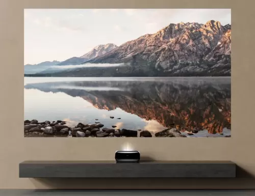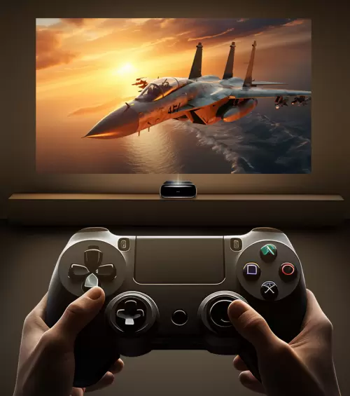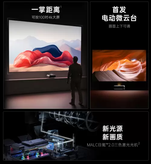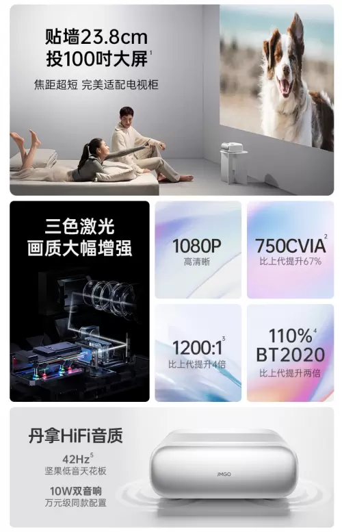 与长焦投影相比,短焦投影最大的优势就在于能最大程度的缩短投影距离,几十厘米的距离就可以投射出百吋画幅,再狭小的空间也能一览“大千世界”。但目前市场上主流的超短焦投影包括激光电视在内,虽然宣传上号称“贴墙投百吋”,但实际上由于投射比大,体验往往不尽如意。
