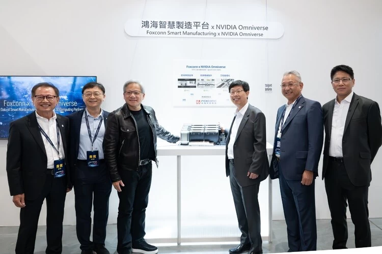 英伟达CEO黄仁勋(左三)与鸿海集团董事长刘扬伟(右三)、工业富联董事长郑弘孟(右二)合影