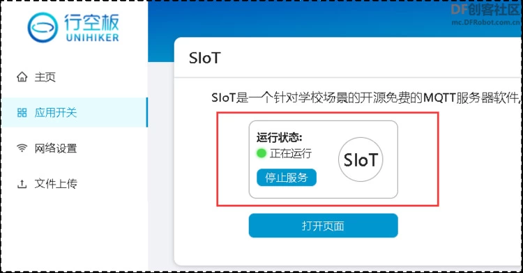行空板中自带SIoT服务,进入系统后,点击“应用开关”连接,进入SIoT开关界面,确认SIoT服务启用,否则采集的数据无法上传,如下图所示行空板已经开启SIoT服务。进入SIoT服务后,新建“温度”、“湿度”、“气压”、“海拔”四个主题。
