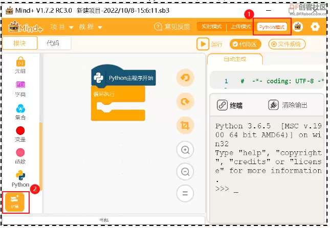 打开Mind+图形化编程软件进入后,将其切换至“python”模式。