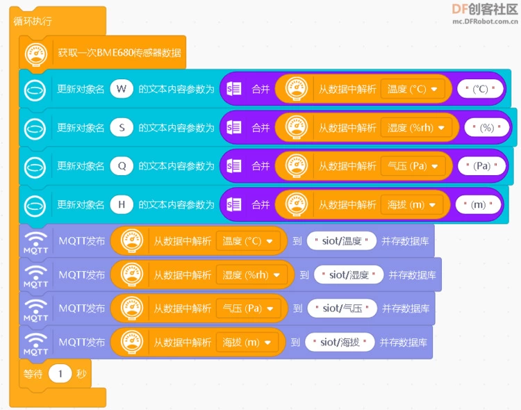 主程序部分:主程序部分在屏幕上显示实时采集的“温度”、“湿度”、“气压”、“海拔”等数据,并同时将数据发送SIoT服务器端。